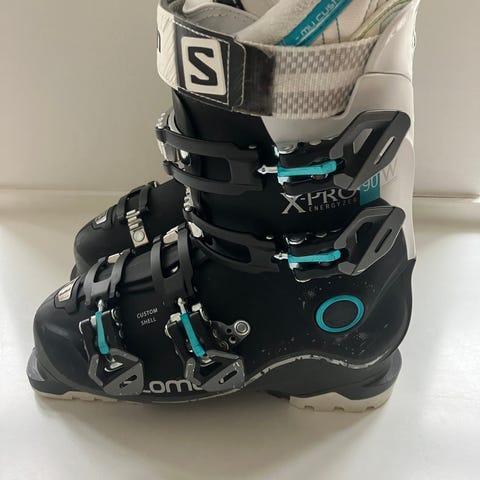 Salomon X Pro 90 Skistøvler i sort farve, størrelse 24-24,5 Skistøvlerne har fire spænder og en justerbar rem for optimal pasform. Designet til alpinski, med fokus på komfort og støtte under skiløb.