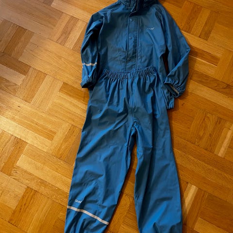 Sættet er vind- og vandtæt med svejset sømme og har et behageligt fleecefor i nakken. Jakken er udstyret med en aftagelig hætte og lukkes med lynlås og trykknapper. Buskerne er med justerbar seler. Størrelsen er 100 cm/3 år. Nypris 299 kr.