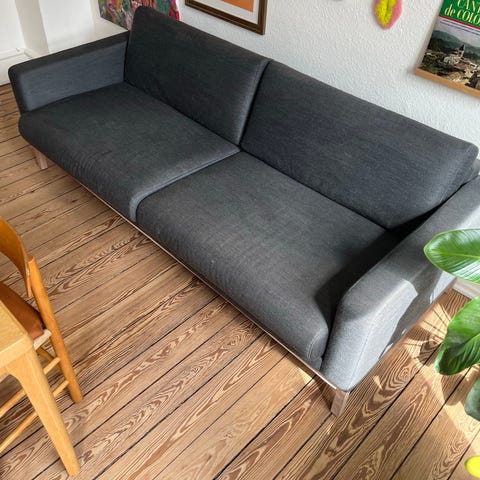 Sofa i blåt uld betræk, 4 sorte stål ben, kan afmonteres.