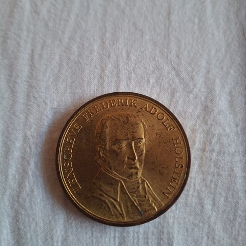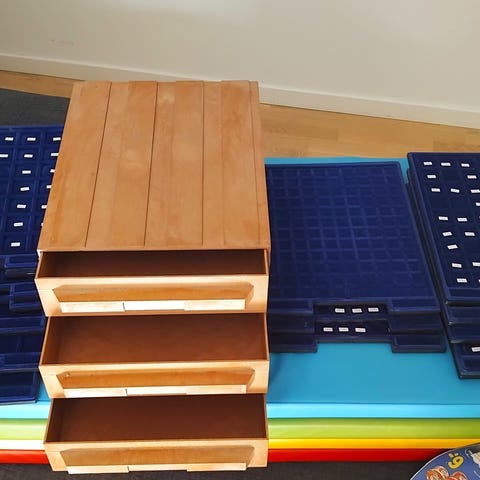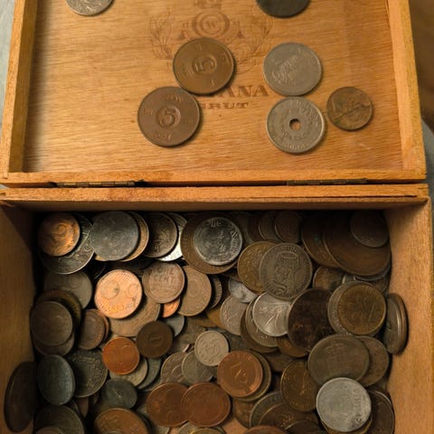 Kasse i rødt træ med plads til 12 mønter . Skrinet har et elegant design med sort indvendigt og indskrifter i låget.