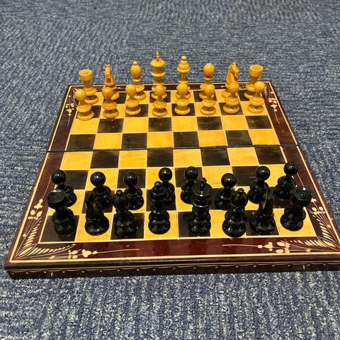 Sælger dette flotte skak spil med figurer skåret i træ. Det er købt i Bosnien for ca. 6 år siden.