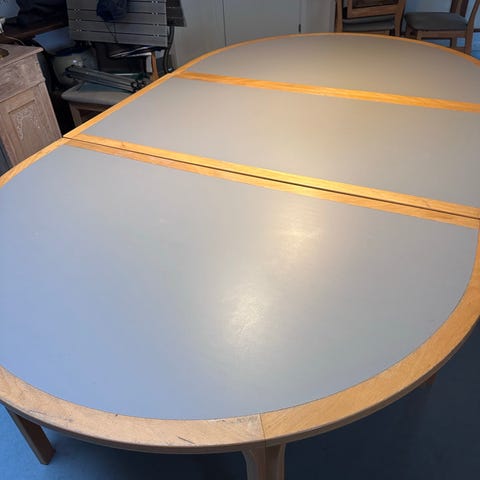 Stort funktionelt spisebord/ arbejdsbord sælges. Det er godt brugt men kan slibes så det bliver fint.