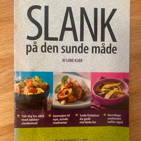 Lone Kjær Sund På Den Fede Måde bog med opskrifter og madlavningstips. Indeholder opskrifter som hot gulerodssuppe, appelsinsalat med rødløg og oliven, samt rissalat med dukkah. Bogen er på dansk og fokuserer på sund madlavning med forskellige ingredienser og retter.