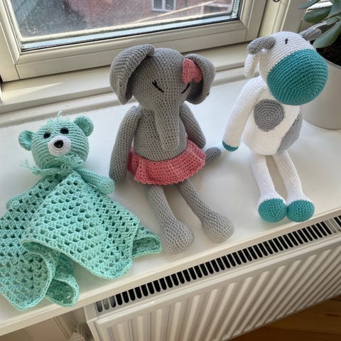 Bamse Hæklet Bamse børnelegetøj i forskellige farver og materialer. Indeholder flere hæklede figurer med bløde teksturer, velegnet til børn.