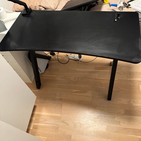 Sort gamer-skrivebord med huller til ledninger i god stand