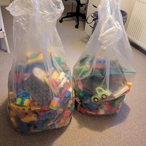 Lego kasser og legepose medfølger.
