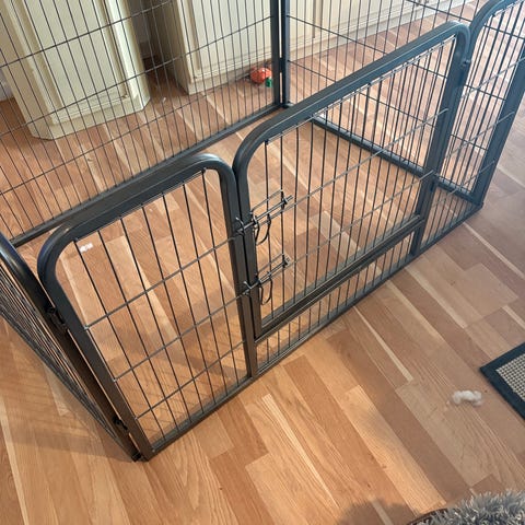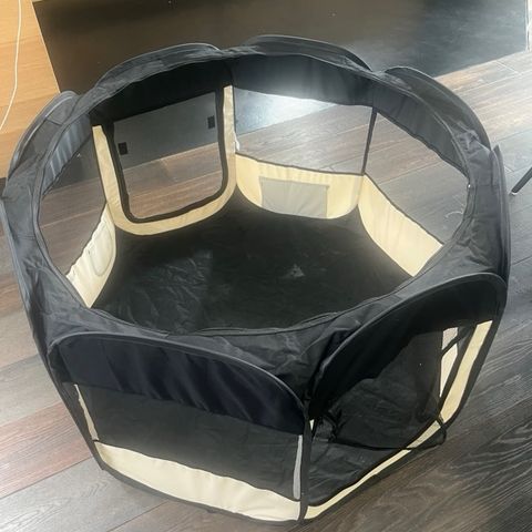 Hvalpeløbegårs i metal med dør, sort. Indhegning består af flere paneler, der kan sammensættes til en firkantet form. Velegnet til at holde hunde sikkert indendørs eller udendørs.
