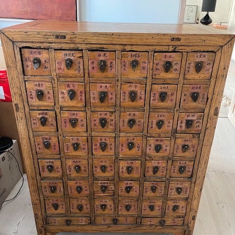 Kinesisk apotekerskab i sortlakeret træ med 8 skuffer og 3 hylder i skabet.