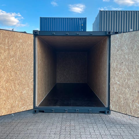 Standard shipping container i blå stål med dimensioner på 20 fod. Containeren er velegnet til opbevaring og er regntæt.Containeren er placeret udendørs på græsareal og fremstår brugt med tegn på slid.
