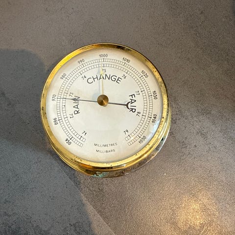 Smukt barometer i rund profileret træramme - i perfekt stand. Diameteren er 17 cm. Praktisk ophæng, så det evt kan hænge i en båd, der gynger.