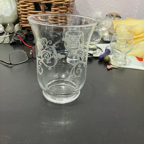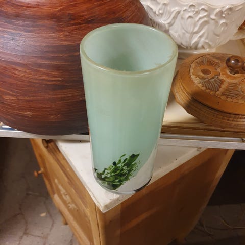 Smuk mønstret glasvase! Uden skår, men glssset er "mælket" i udseenet i nederste halvdel af vasen, se billeder. Måler 20 cm i højden og 9,5 cm i diameter.