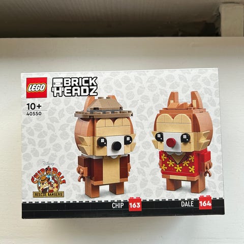 LEGO BrickHeadz Chip og Dale byggesæt bestående af to figurer, Chip og Dale, lavet af plastik i klassisk LEGO stil. Figurenes detaljer inkluderer karakteristiske ansigter og farver, designet til samling og leg.