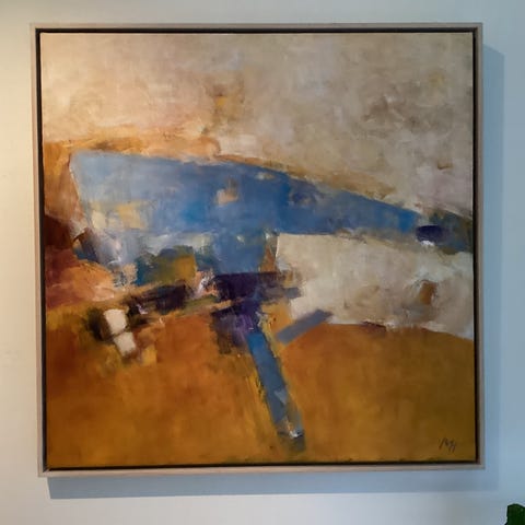 100 x 80 Magda Høgh Abstrakt maleri udført i akryl på lærred med dominerende farver i gult, blå og beige. Maleriet har en svæveramme i lyst træ som medfølger. Det har en moderne og ekspressionistisk stil. Sælges uhørt billigt på grund af pladsmangel.