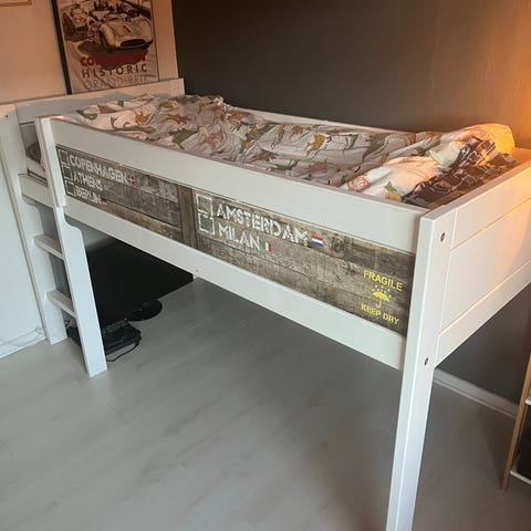 IKEA Højseng børneseng i hvidt træ. Sengen er designet til børn og har en forhøjet ramme, hvilket giver plads under sengen til opbevaring eller leg. Sengen har en enkel og robust konstruktion og passer til et børneværelse.