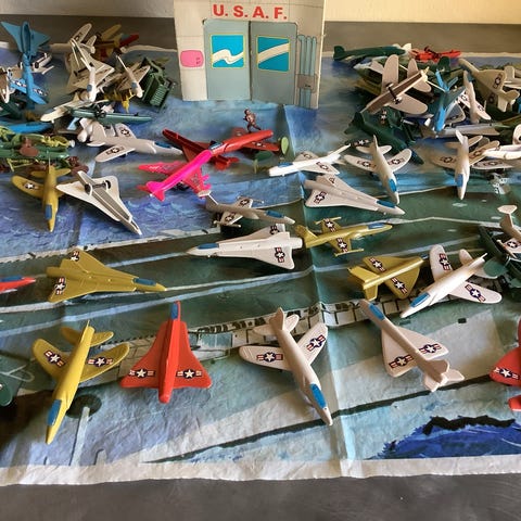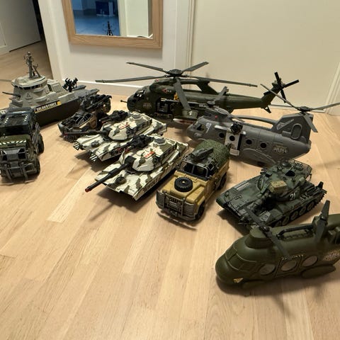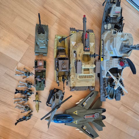 Jagerflyvmaskine , helikopter, jeep og båd med figurer