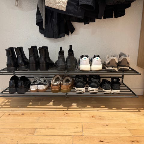 Med sine to rummelige skuffer giver stativet dig masser af plads til at holde sko, tilbehør og småting organiseret. Fremstillet i robust spånplade, der sikrer holdbarhed og et tidløst udtryk, som passer til enhver indretningsstil.