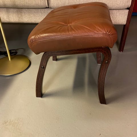 Dette er en vintage foldbar fodskammel med blomsterprintet gobelinbetræk, der har en gyngefunktion.