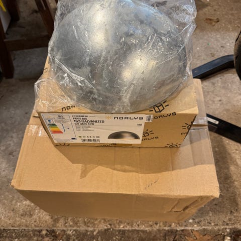 2 Stk. Norlys Væglampe Basel 661 i galvaniseret stål og en i kobber sælges for 500,00 kr. pr. stk. De er 34 cm høje, 28 cm brede og 23 cm dybe.