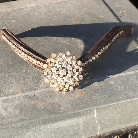 Sort læderpandebånd til heste, med swarovski sten og perler.