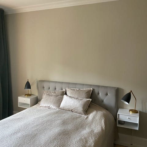 Nb. Der er monteret en LED stribe rundt i kanten, på bagsiden, der lyser væggen op, rundt om gavlen, og giver en behagelig og dæmpet belysning om aftenen. - optimalt til at læse eller bare som stemnings belysning.