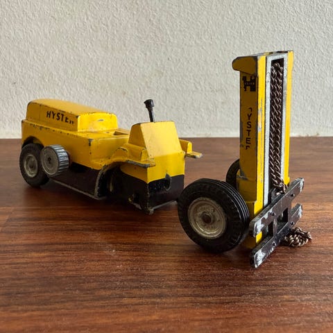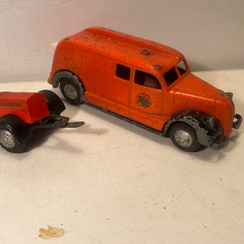 Tekno Triangel med et sæt blikhjul, chassis til brandbil og 4 førerhuse. Gammel type gaffeltruck, ommalet, ellers hel stand og hejs fungerer