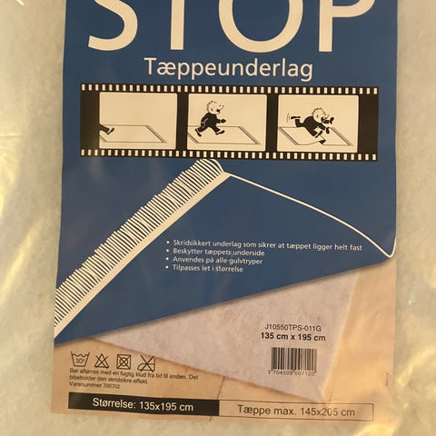 Kvalitets antiskrid underlag til gulvtæpper. Nyt og ubrugt og i original emballage. Måler 140 x 200 cm. Fra ikke-ryger hjem. Nypris kr. 600,-