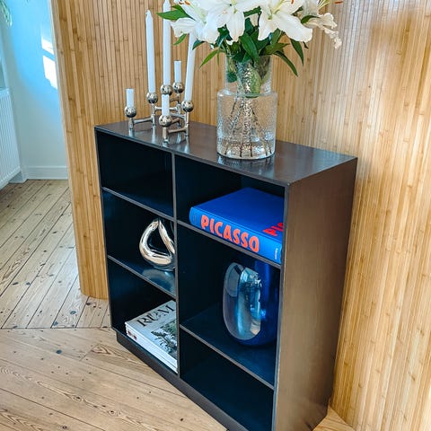 Med sine to praktiske skuffer og rummelige hylder tilbyder bogreolen både stil og funktionalitet – ideel til bøger, dekorationer eller opbevaring af hverdagsting.