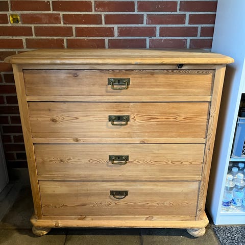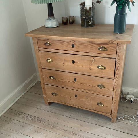 Malet fyrtræs kommode i creme farver med 4 skuffer med fine detaljer. Brugt med enkelte brugs mærker.