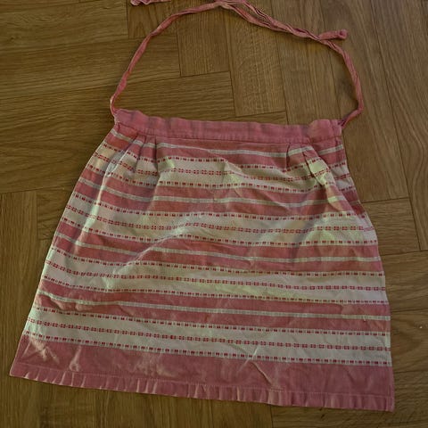 Antik retro vintage forklæde fra 50-60’erne. Brugt af en kokkepige “i huset”. Gammel men stadig flot. Lille rift (se billederne). Bindes på ryggen.