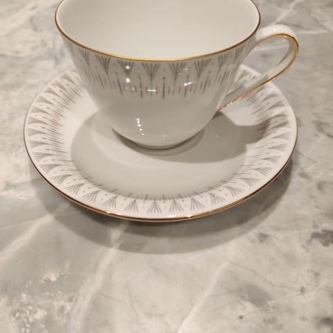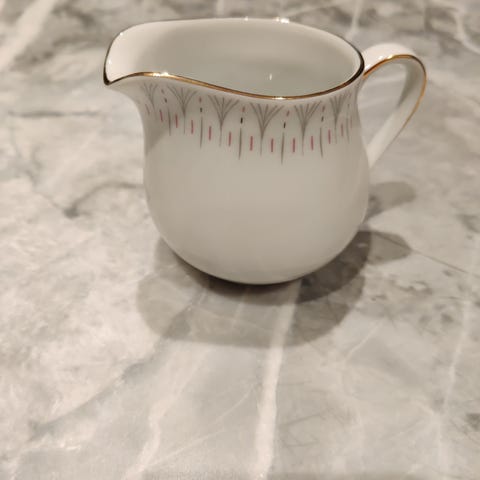 Kongeaa Eschenbach sukkerskål i hvidt porcelæn med guldkant og dekorative mønstre.