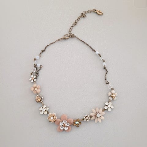 Kort oxyderet halskæde fra Pilgrim med smukke ”charms” i gyldne og svagt rose farver og fine detaljer på kæden. Længde (målt fladt) ca. 39 cm. Pæn og brugt få gange, æske medfølger. Husker ikke nypris. Sælges for 100,- + evt. forsendelse. Kan også afhentes i Græse Bakkeby, Frederikssund