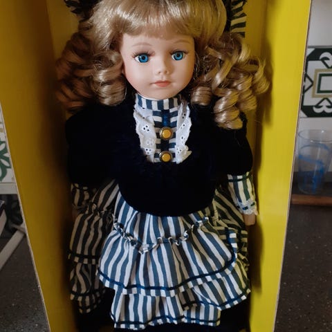 Dukken har et ansigt med lyse øjne og rød læbe. Den er iført en rød frakke med blå detaljer.,Afhentes i:,Røde Kors Glostrup (161),Bemærk at mail, chat og beskeder ikke besvares, og varen skal købes på knappen "Gå til varen"