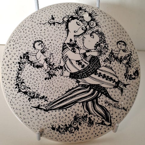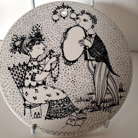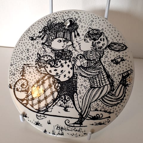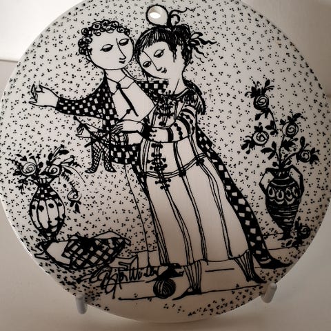 Platten har en et tegnet sort dekoration af to personer. Udført på sort porcelæn, ,Afhentes i:,Røde Kors Glostrup (161),Bemærk at mail, chat og beskeder ikke besvares, og varen skal købes på knappen "Gå til varen"