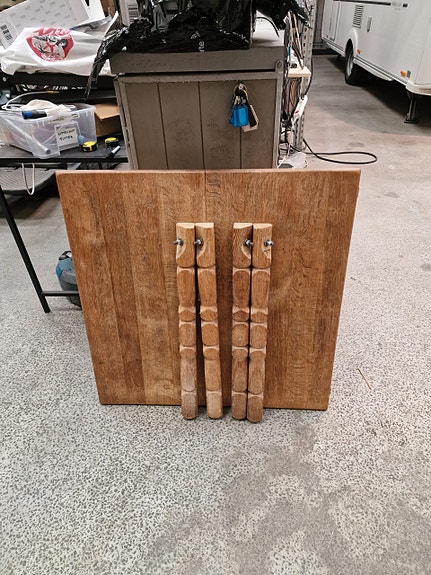 To hjemmelavede/uoriginale tillægsplader medfølger, på hver 52 cm. Bordet trænger til en slibning og skinnerne kører godt og ubesværet, tillægspladerne driller lidt men virker med lidt nørklen.