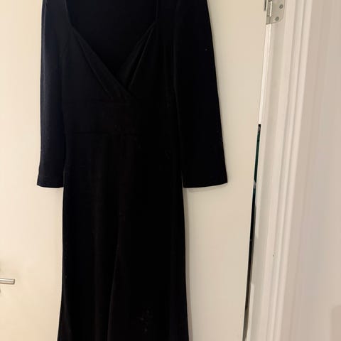 DVF: Elegant sort kjole med lange ærmer og en rund halsudskæring, model Payuma. Kjolen har en lige pasform og når til knæene. Den har diskrete lommer i siderne, der giver et praktisk touch. En tidløs klassiker, der kan styles op eller ned til enhver lejlighed. Brugt få gange, næsten som ny og fejler intet. US str 4, svarer til S. Mål på billeder.