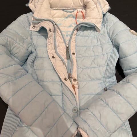 Super fed lyseblå superdry jakke med dobbelt lynlås, kan tage huen af.