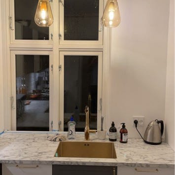 Nuura Anoli er en loftslampe med tre lamper af mundblæst opal glas. Lampen har messing detaljer og ledningerne kan justeres i længden så den passer til det rum den skal hænge. Lampen er under to år gammel og uden fejl. Lampen koster ca. 9000 kr. fra ny