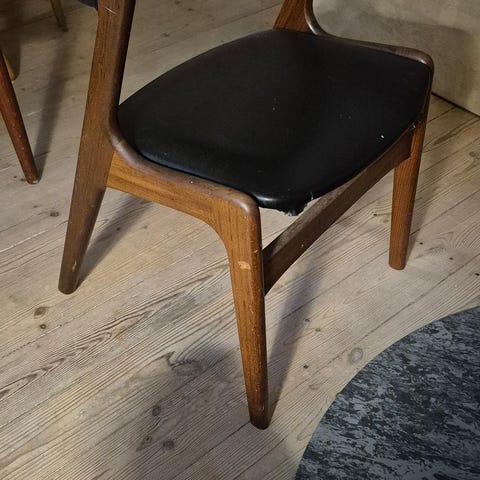 Fin teak stol i dansk design - design minder om Kai kristiansen model firechair t21. Stolen trænger til ompolstring af sæde og lim i samlinger