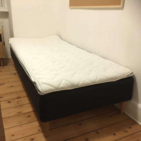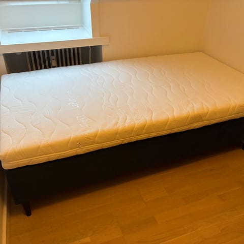 Med ben. Brugt et halvt år, fremstår som ny inkl. topmadras. To kuvertlagner som passer i målene kan følge med gratis