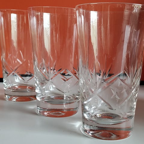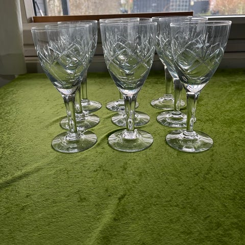 Glassene har indgraverede mønstre og er fremstillet i klart krystalglas.