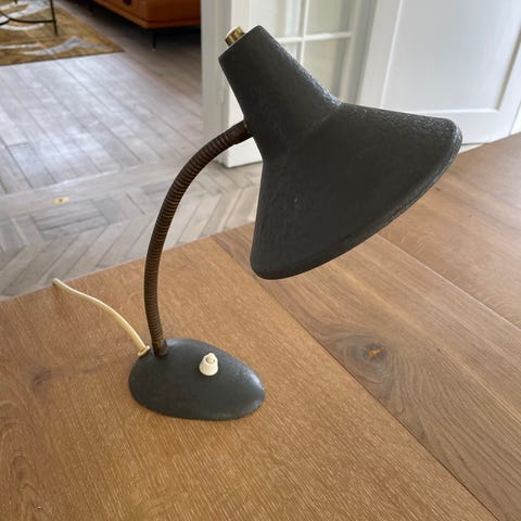 Den har afbryder på lampefoden og er i flot stand, selvom den er fra 1960'erne.