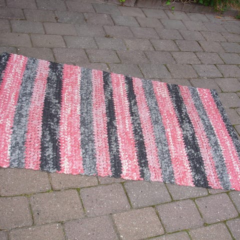 Sort fint kludetæppe, tæppe, gulvtæppe fra Søstrene Grene. 90% læder, 10% bomuld.