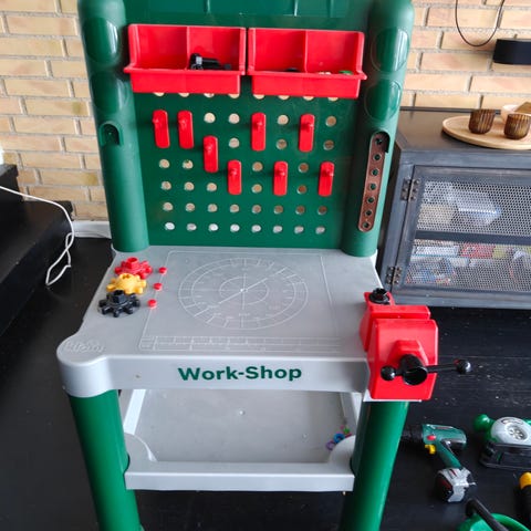 En arbejdsbænk fuld af værktøjstilbehør, søm, tandhjul, en radialboremaskine og dens 3 udskiftelige bor, skruenøgle, hammer, skruetrækker og andre værktøjer. Alt dette tilbehør gør det muligt for børn at lege gør-det-selv både sikkert og sjovt