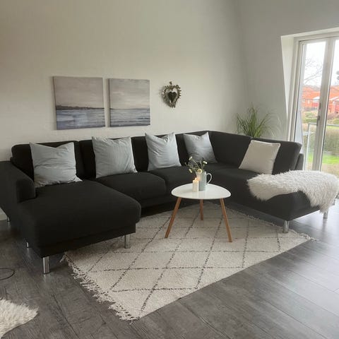 Ilva Bjørn Højrevendt Sofa i offwhite stof med ben i sort metal. Sofaen har sæde- og ryghynder i koldskum og skumgranulat. Mål: 283 cm i længden, 223 cm i bredden, og 46 cm i sædehøjde.