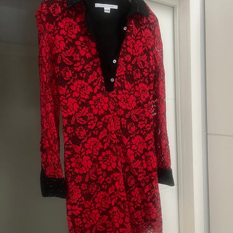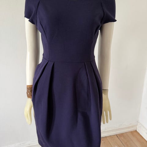 DVF: Elegant grå kjole med dekorative detaljer. Kjolen har en tætsiddende pasform og en længde til lige under knæet. Den er designet med paneler og bånd, der fremhæver silhuetten. Model Aegis, uld mix. Brugt enkelte gange, minimal alm brugspor, ingen defekter. US str 6, svarer til M. Tjek mål på billeder