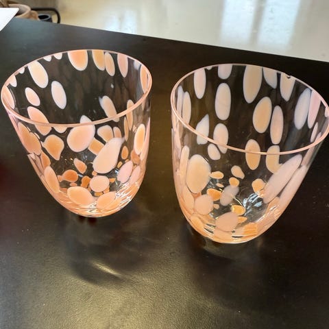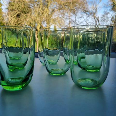 Anna Von Lipa 5 glas i forskellige farver, herunder flerfarvet og gul. Glasene har et unikt design med varierede mønstre og former. Materiale: glas. Velegnet til servering af drikkevarer.