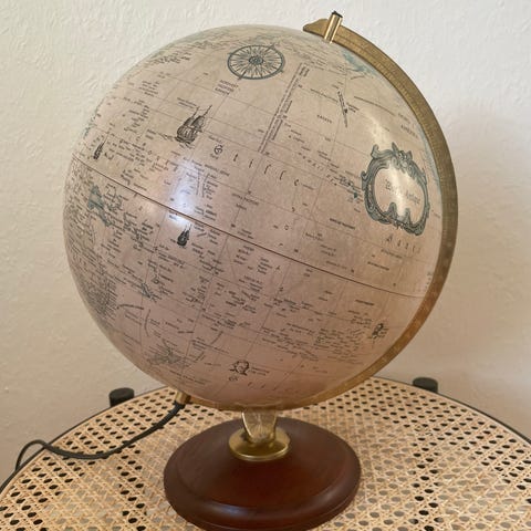Smuk gammel globus. Fine dæmpede farver. Skal have ny pærer og har en skade øverst. Se billede.