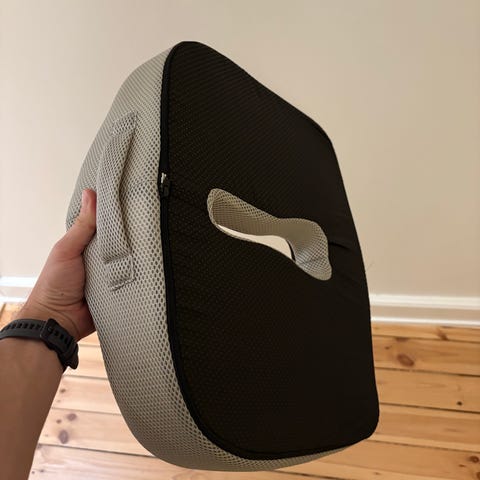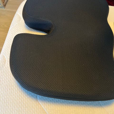 DYN siddepudde, 40cm, i sort farve med perforeret overflade for luftgennemstrømning. Fremstillet i fleksibelt materiale, designet til at give komfort og støtte ved siddende brug.