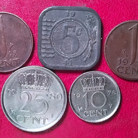 11 mønter fra Holland - blandet Cent og Gylden fra Nederlanden: