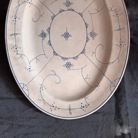 Ovalt musselmalet stegefad - 150 kr. Hentes i Karise.